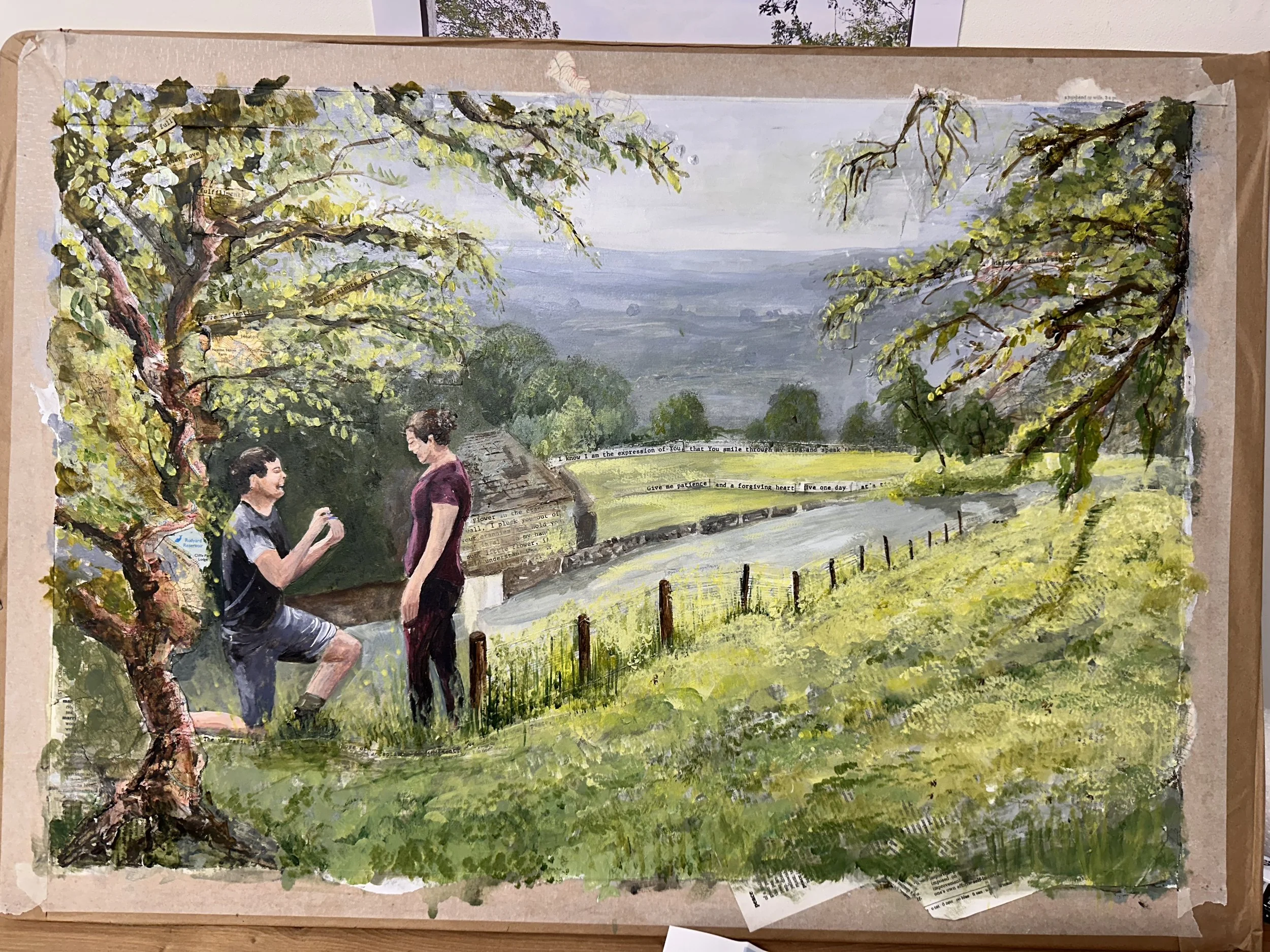 Bespoke wedding paintings created from your photographs, memories, and meaningful details. Layers of text, maps, vows, lyrics, and personal references can be woven into the piece to capture not just the scene, but the feeling of the day.